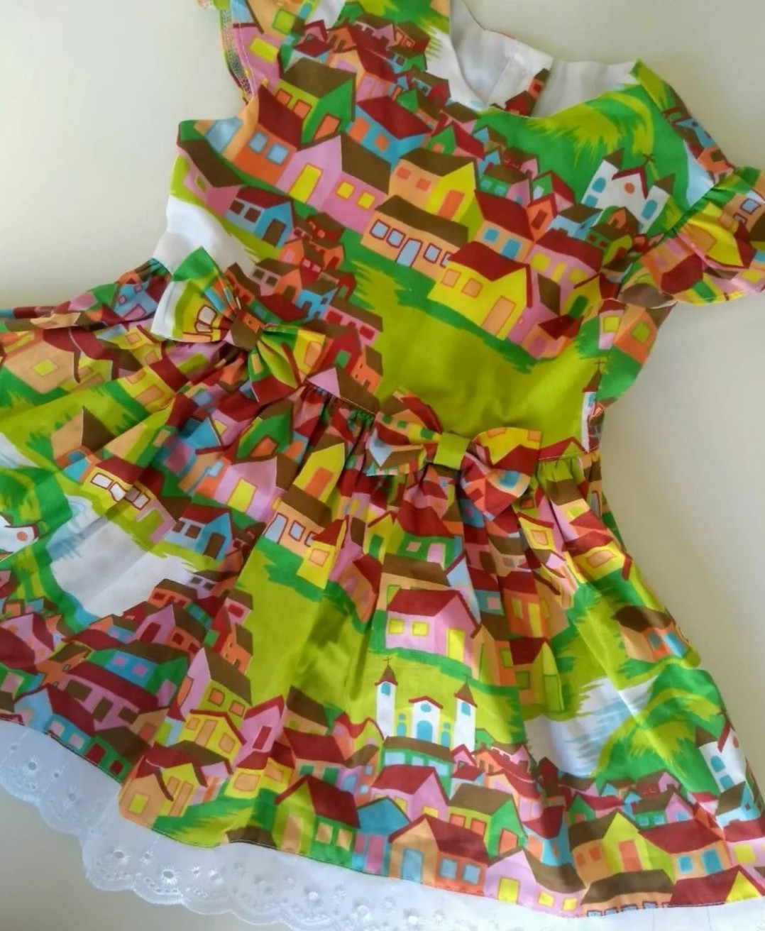 Saia franzida, manguinha franzida, abotoamento nas costas.